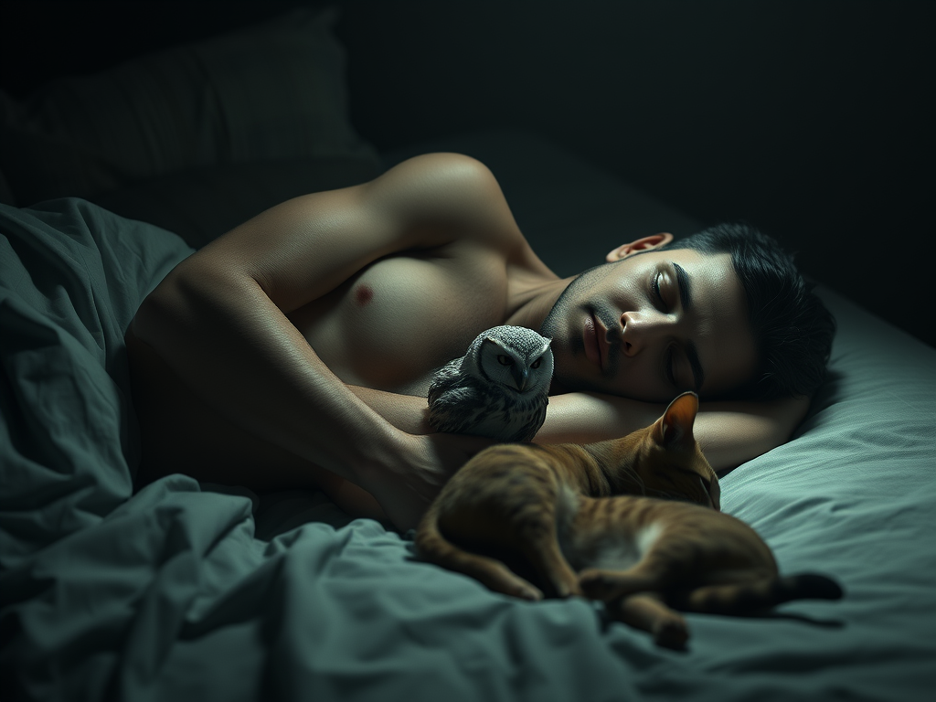 In uno di questi sogni, una figura riposa mentre accanto a lei si avvicinano un gatto e una civetta. Non c’è tensione, non c’è allarme. Gli animali non interrompono il sonno: cercano un posto. Il gatto si sistema con naturalezza. La civetta, invece, compie un gesto più preciso: si avvicina sotto il braccio, come a cercare protezione, e solo allora si ferma a riposare.